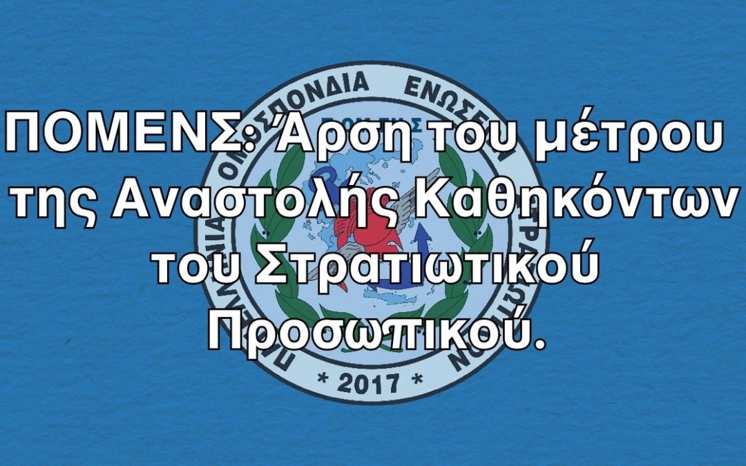 1. Η Πανελλήνια Ομοσπονδία Ενώσεων Στρατιωτικών – ΠΟΜΕΝΣ επανέρχεται στο θέμα, της επιβολής σε στρατιωτικούς του ειδικού διοικητικού μέτρου της αναστολής καθηκόντων, κατ’ εφαρμογή του άρθρου 206 παρ. 6 του (α) σχετικού, καθόσον η Πολιτική και Στρατιωτική μας Ηγεσία δεν έχει απαντήσει μέχρι σήμερα σε πλήθος ερωτημάτων και αποριών, που είχαμε θέσει με το (γ) όμοιο https://www.pomens.gr/enimerosi/epistoles/1631-pomens-anastoli-ergasias-erotimata-pou-prepei-na-apantithoyn-amesa, στα οποία οφείλει να απαντήσει άμεσα και τα οποία θα είχαν αποφευχθεί εάν είχε εκδοθεί η Υπουργική Απόφαση και σχετική διαταγή με τις λεπτομέρειες εφαρμογής του άρθρου 206 Ν.4820/21, όπως προβλέπεται και στην παρ.7 περ. α του ιδίου.