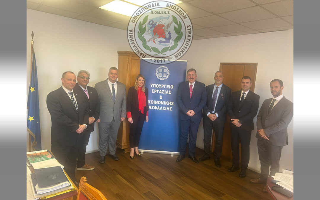 Την Τρίτη 11/11/2025, αντιπροσωπεία της ΠΟΜΕΝΣ, με επικεφαλής τον Πρόεδρο Ηλία Κολλύρη, πραγματοποίησε θεσμική συνάντηση με την Υφυπουργό Εργασίας και Κοινωνικής Ασφάλισης κ. Άννα Ευθυμίου για τα ασφαλιστικά και συνταξιοδοτικά θέματα των εν ενεργεία συναδέλφων μας στρατιωτικών.